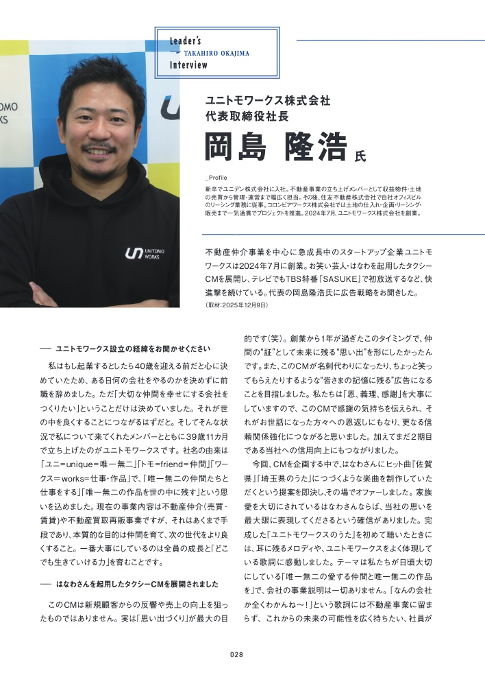 不動産仲介事業を中心に急成長中のスタートアップ企業ユニトモワークスは2024年7月に創業。お笑い芸人・はなわを起用したタクシーCMを展開し、テレビでもTBS特番『SASUKE』で初放送するなど、快進撃を続けている。代表の岡島隆浩氏に広告戦略をお聞きした。